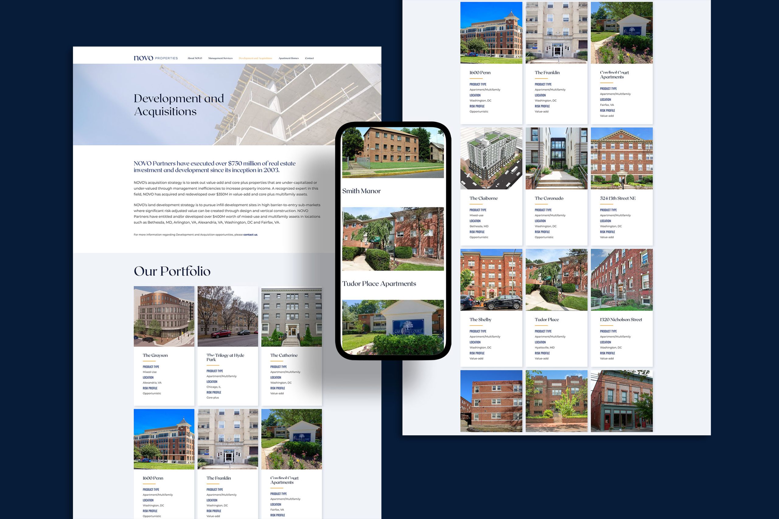 The company website was reinvented to showcase NOVO Properties expansive portfolio of properties.Navigation menus are maintained across the top of the page, ensuring a consistent style and optimizes the user experience by making it easy to navigate for information.